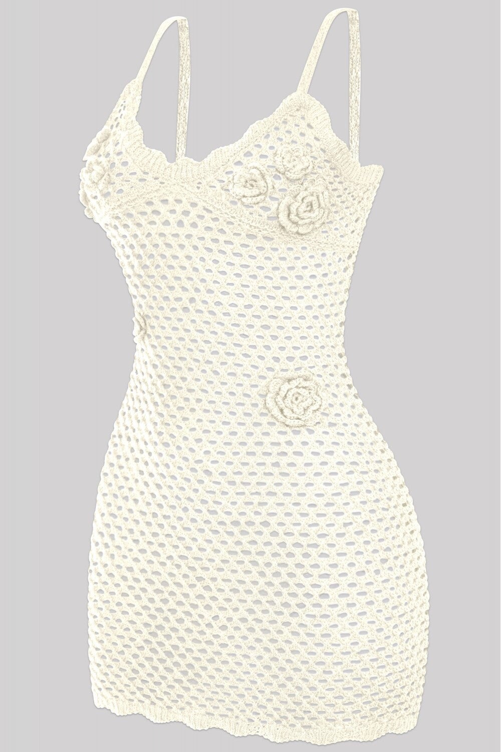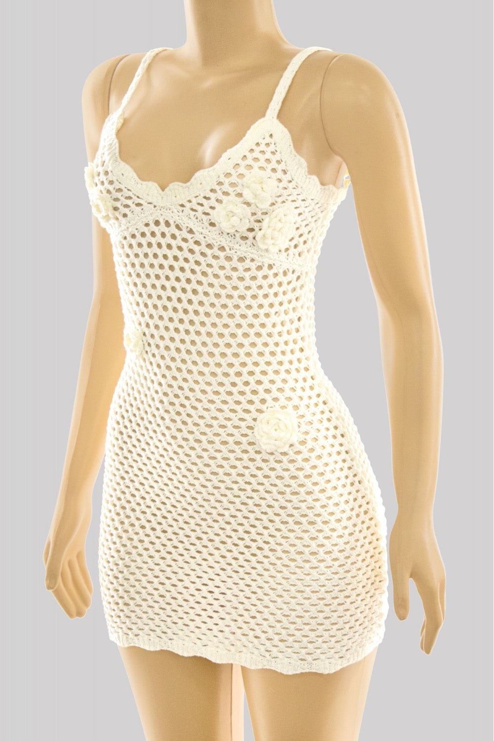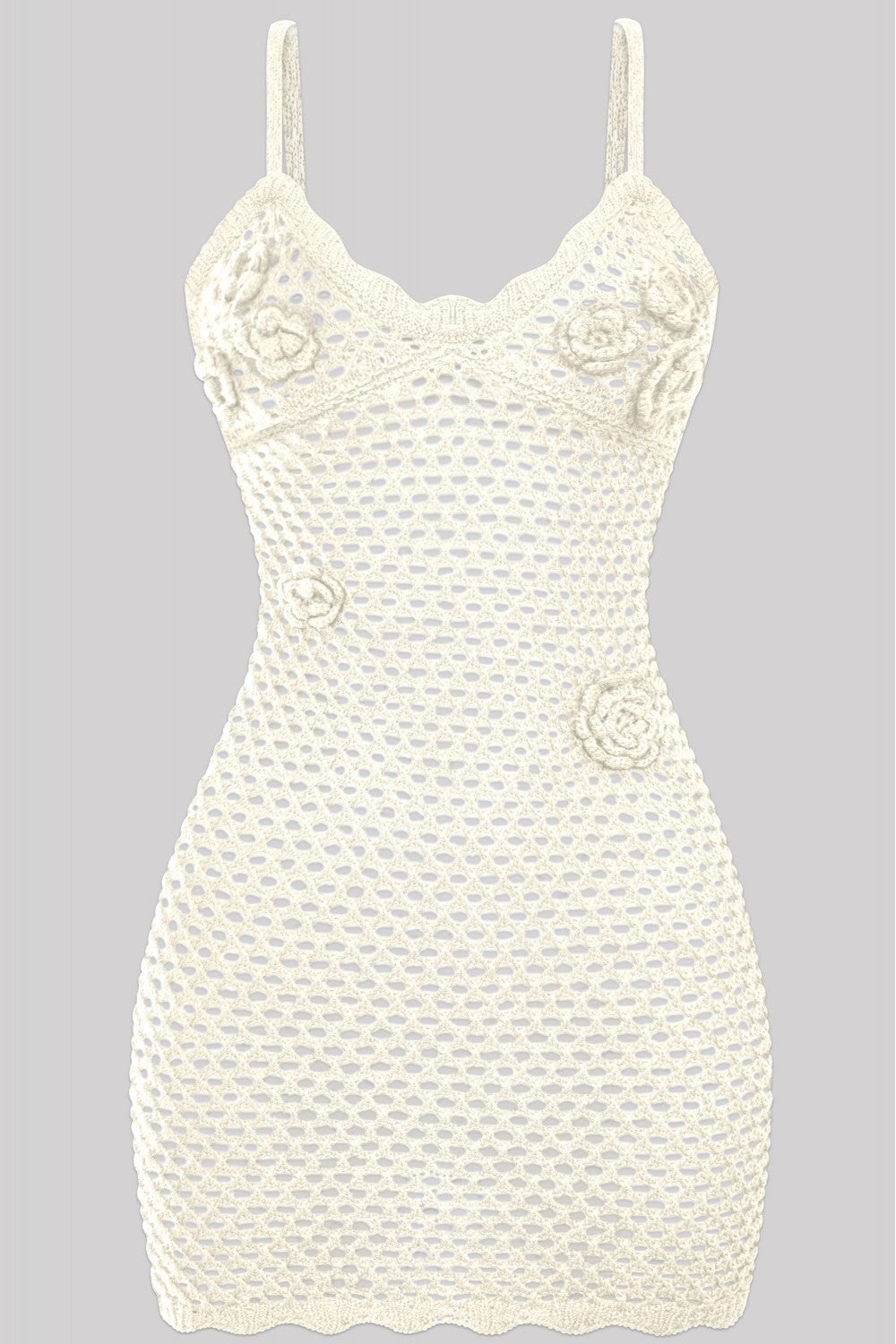 Pack this show-stopping crochet mini for your next getaway. The Camilla features a daring bodycon silhouette in sheer knit crochet, lined for confidence and designed to turn vacation moments into unforgettable ones. Adjustable straps customize your fit while dimensional floral accents add resort-ready texture. The scalloped hem brings playful sophistication, and stretchy fabric moves with you through every adventure. Mini length in classic ivory—your new vacation essential for those ready to embrace bold style.
