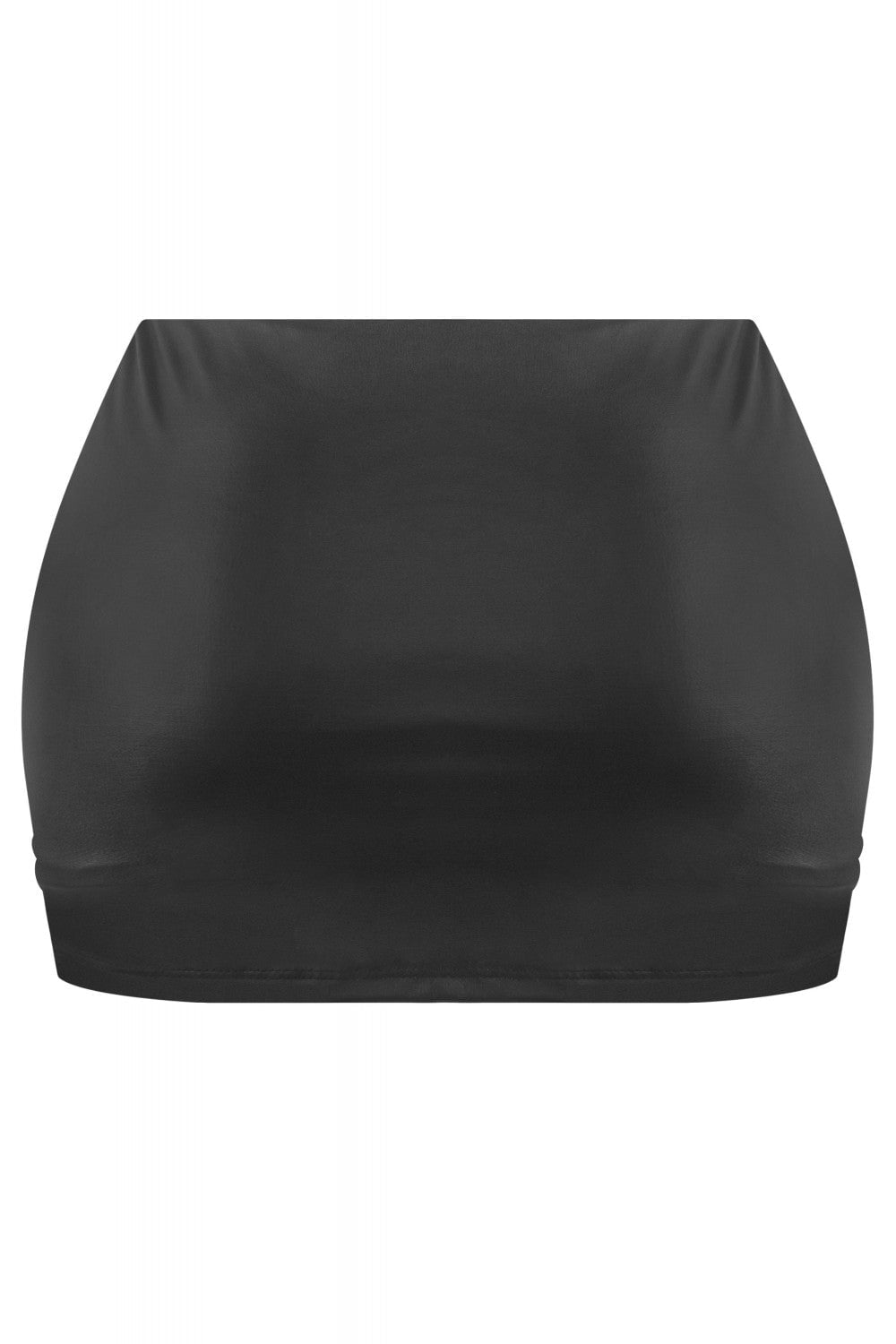 This black faux leather skort features a daring low-waisted fit with side slits that reveal the stretchy shorts underneath. Its mini length adds bold appeal, while the stretchy material ensures comfort and freedom of movement. Perfect for making a confident statement. 94% POLYESTER / 6% SPANDEX. Made in USA