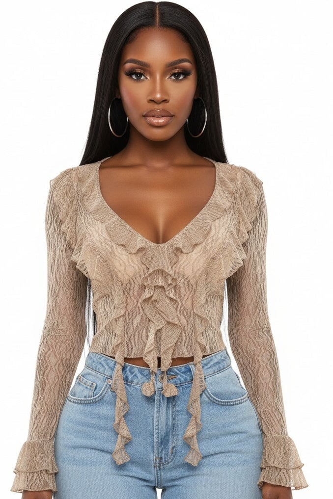 Elevate your style with the Roxette Lace Ruffle Sheer Top in Taupe. This playful piece features a delicate ruffled neckline and charming bell sleeves with ruffle details, adding a flirty touch to any outfit. Its sheer mesh fabric offers just the right amount of boldness, while the stretchy fit and front button closure make it comfy and easy to wear. Perfect for twirling through your day with effortless flair!