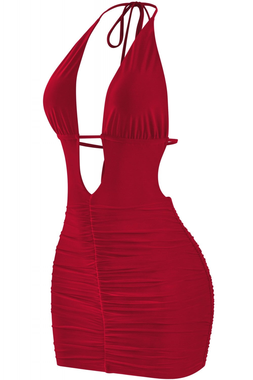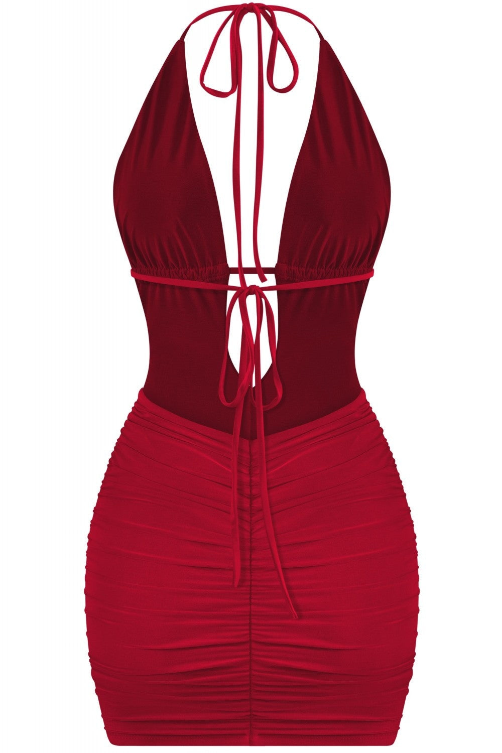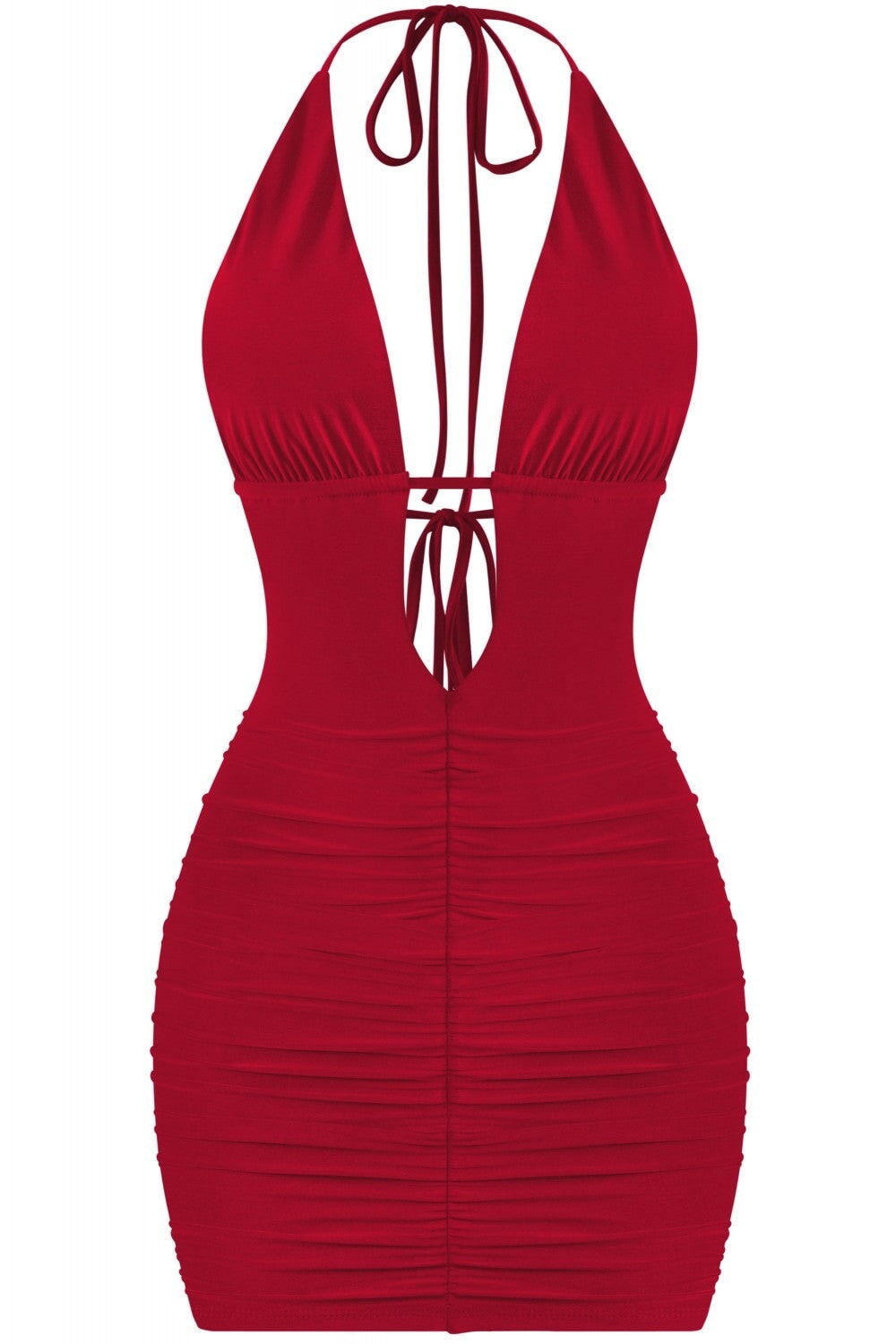 Looking for a flirty and fun dress? Look no further than our 100 Shots Mini Dress in Grey. With a sleeveless design, halter back tie, and deep plunging neckline, this dress offers a playful and alluring look. The ruched skirt and mini length add a flirty touch, while the stretchy and double layered fabric ensure a comfortable fit all night long. Plus, the open back and back self tie add a fun and unexpected detail. This dress is perfect for a night out or any special occasion. 94% Polyester 6% Spandex . Made in USA