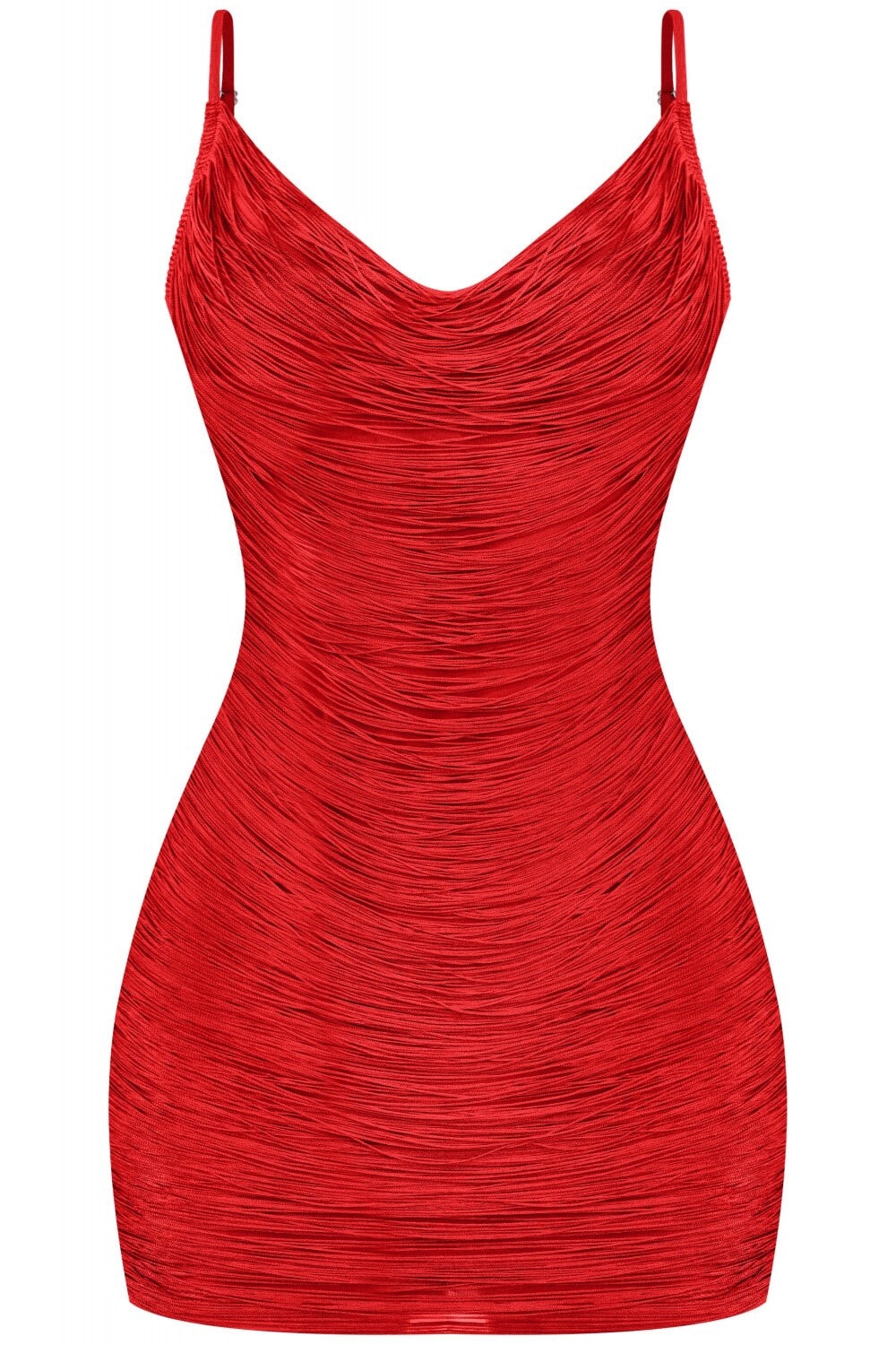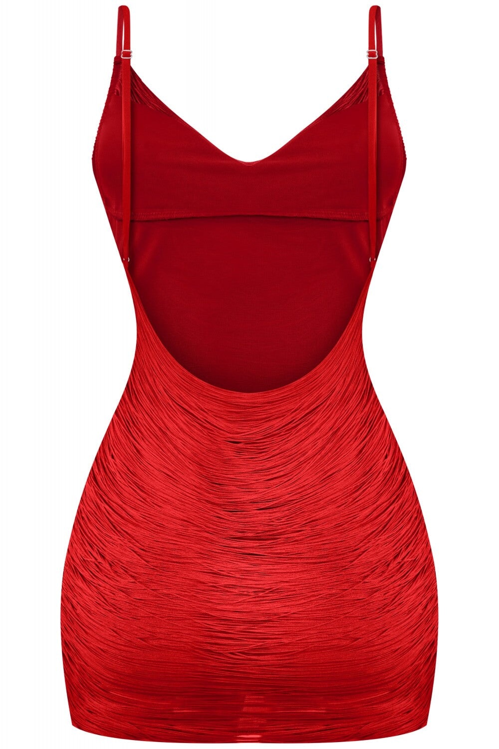 Turn heads this season in our Feeling Hot Fringe Mini Dress. This daring red number features adjustable cami straps and a bold backless design that commands attention. The shimmering fringe overlay fabric moves with every step, while the convenient side zipper ensures an effortless fit. Crafted with a sheer mesh lining and subtle stretch for comfort, this mini dress transitions seamlessly from holiday parties to late-night cocktails. Perfect for those ready to make a statement.