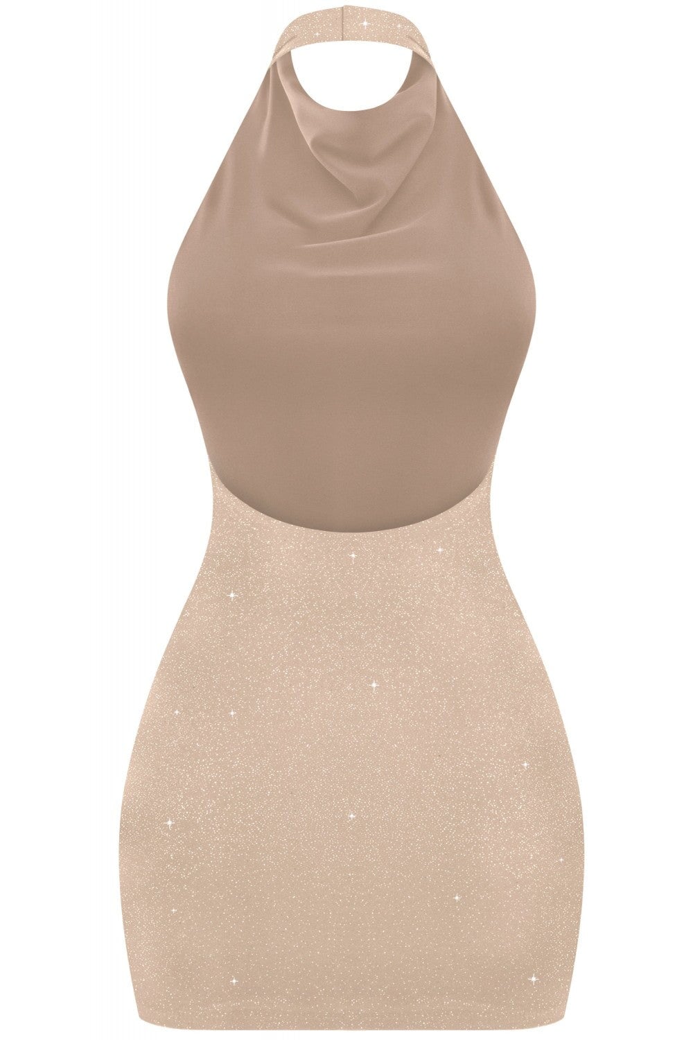 Turn heads in this audacious Holly Cowl Neck Glitter Mini Dress. The sleeveless halter silhouette frames your shoulders while the dramatic open back commands attention. Crafted from stretchy, sparkly glitter fabric that catches every light, this taupe mini hugs your curves with confidence. Lined for comfort and support, it's the ultimate statement piece for nights when you're ready to own the room. 95% Polyester 5% Spandex. Made in USA.