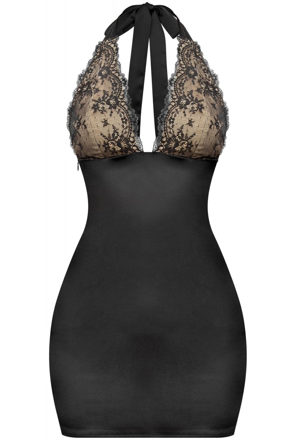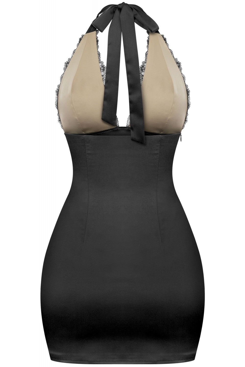 Flirty and fearless, this sleeveless satin mini dress commands attention with its daring open back and delicate lace bust panel. The halter neckline and self-tie back create an effortlessly chic silhouette, while the lined construction and subtle stretch ensure comfort all night long. Perfect for date nights, parties, or whenever you want to turn heads in bold red. Fabrication: S: 100% NYLON, L: 90% NYLON / 10% SPANDEX. Imported.