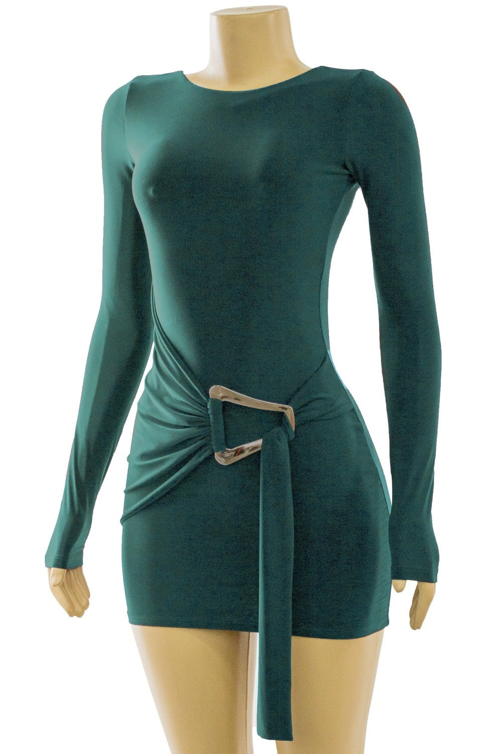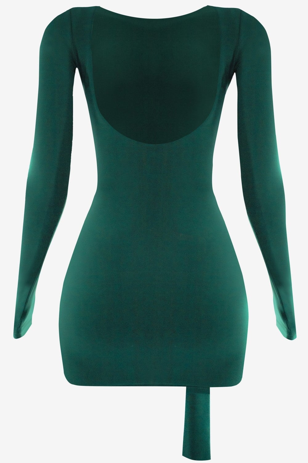 Conquer the night in the Maison Mini Dress Hunter Green. Featuring a daring open back, gold trim and draping detail, this long sleeve dress will make you the star of any event. With a stretchy, double layered design, it's both comfortable and stylish. Unleash your bold side and make a statement with this mini length dress. 94% Polyester 6% Spandex
