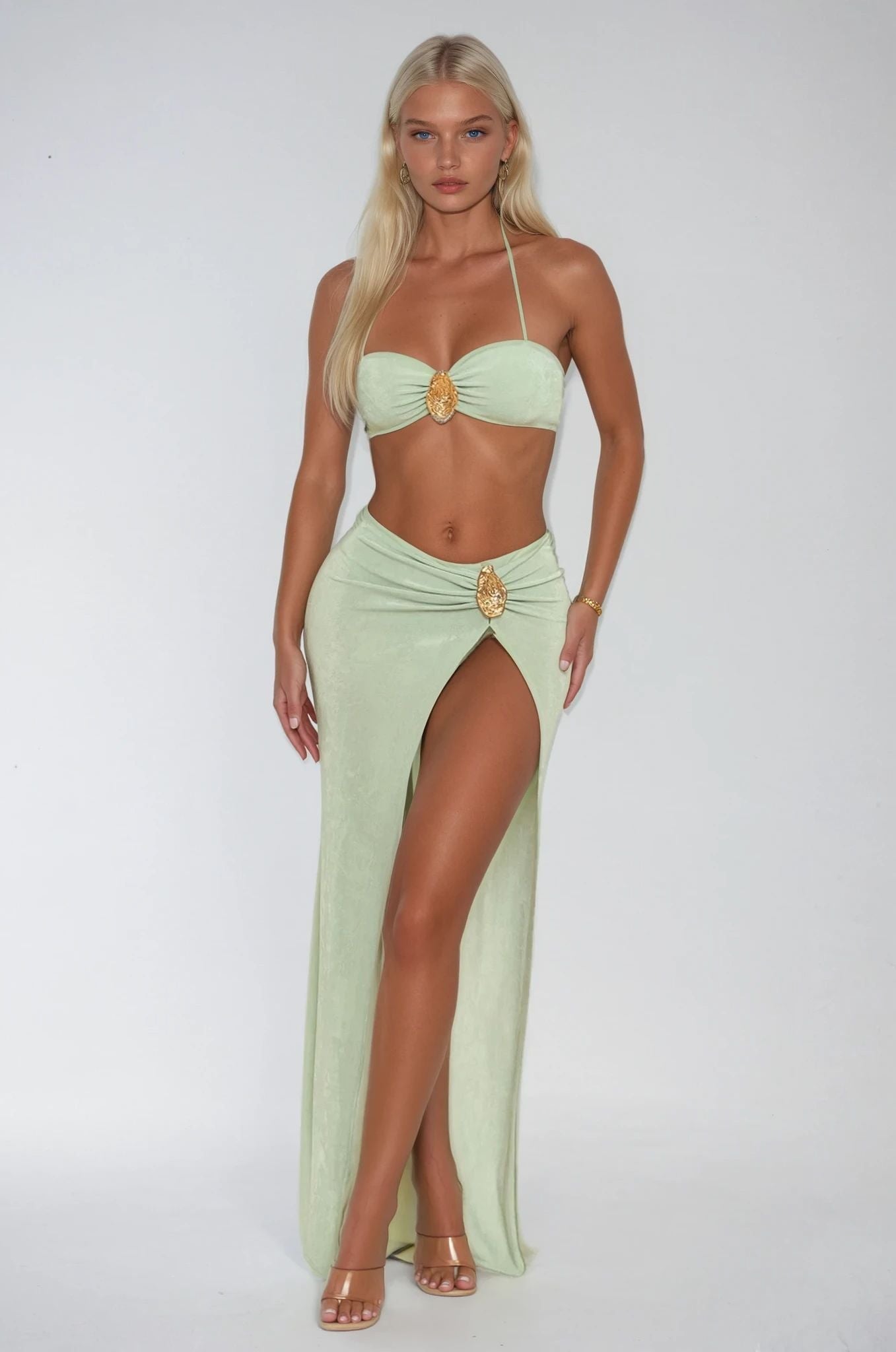 Escape in style with this flirty two-piece set featuring a cropped top and high-slit maxi dress in refreshing mint. The open back design adds an unexpected allure, while the super stretchy fabric moves with you for all-day comfort. Whether you're lounging poolside or turning heads on date night, this resort-ready set delivers effortless elegance with a touch of sass. Fabrication: Self 92% Viscose 8% Spandex, Lining 100% Polyester.