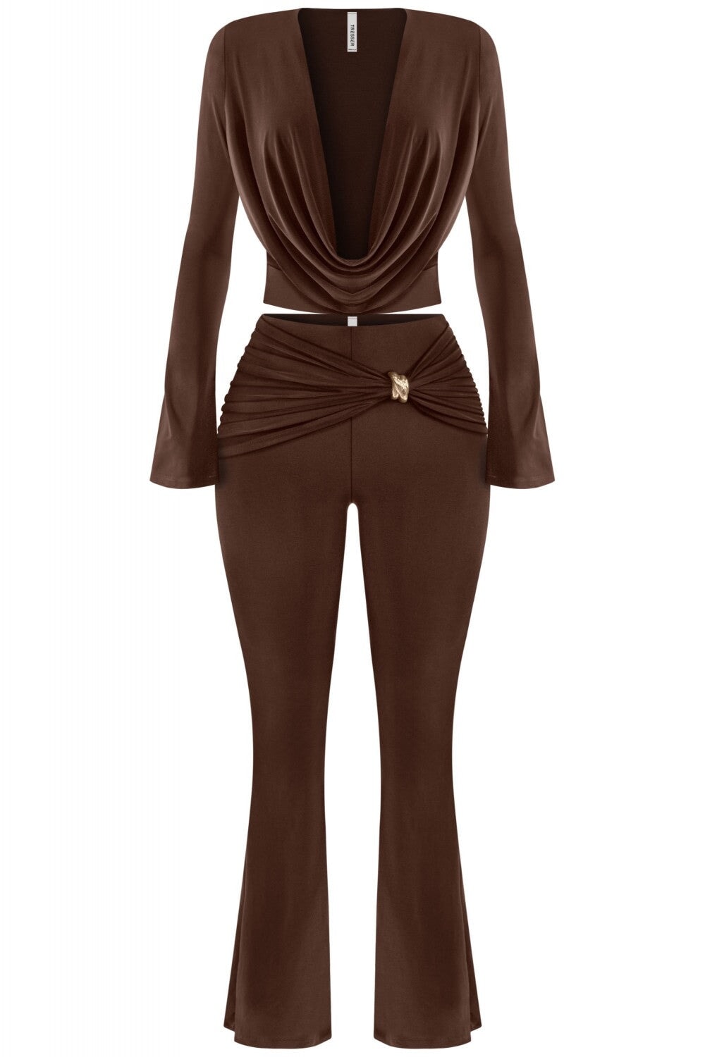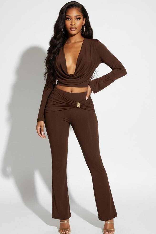 Make a bold statement in this daring two-piece set featuring a cropped top with dramatic long bell sleeves and a plunging cowl neckline, crafted with luxurious double layering for depth and movement. Pair it with high-waisted flare pants adorned with elegant gold trim and graceful draping details that elongate your silhouette. Perfect for nights when you want to command attention with sophisticated edge and undeniable style. 94% Polyester 6% Spandex, Made in USA.