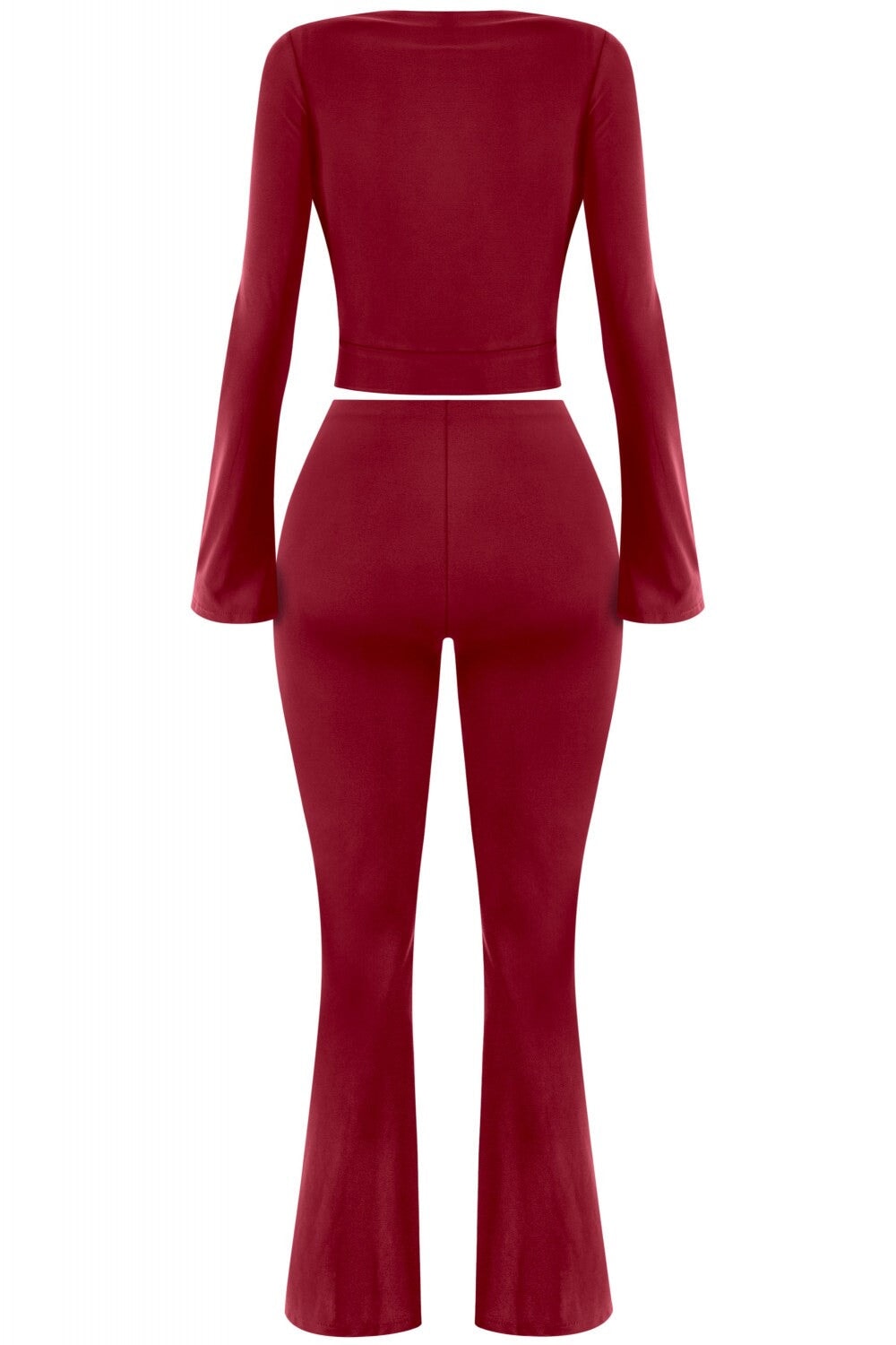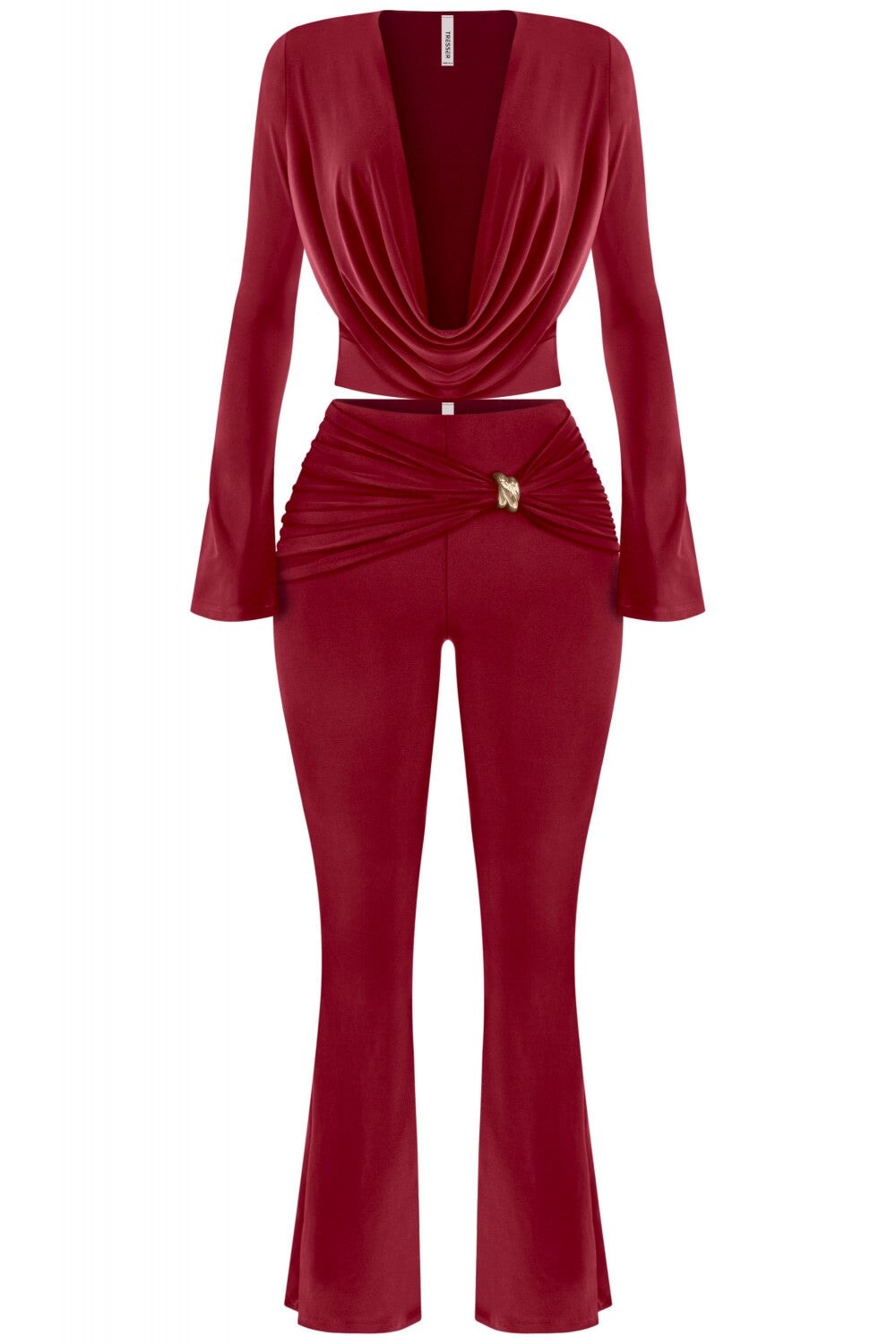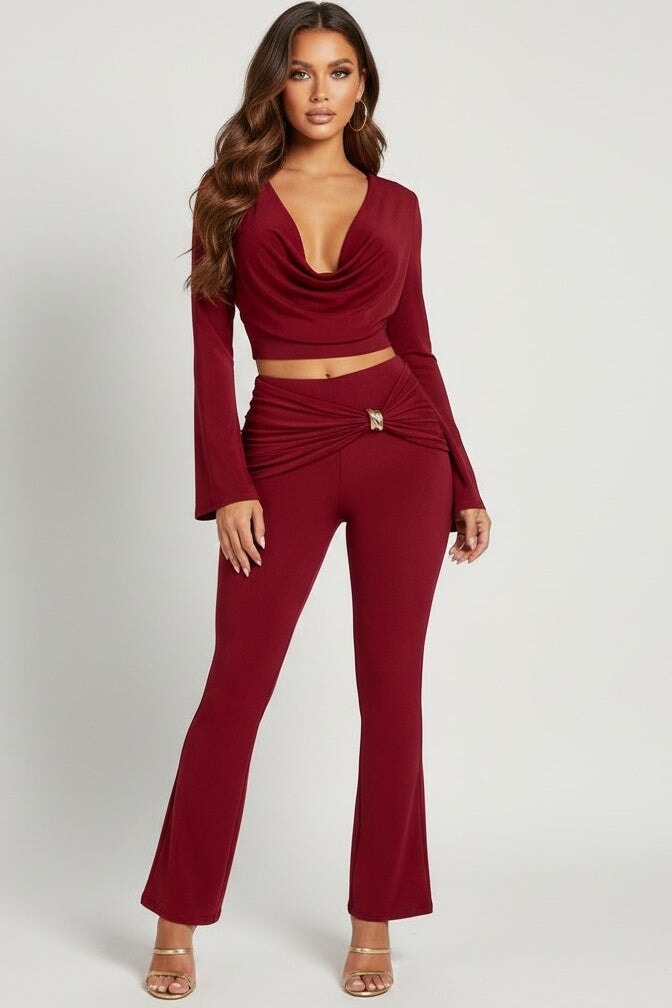 Make a bold statement in this daring two-piece set featuring a cropped top with dramatic long bell sleeves and a plunging cowl neckline, crafted with luxurious double layering for depth and movement. Pair it with high-waisted flare pants adorned with elegant gold trim and graceful draping details that elongate your silhouette. Perfect for nights when you want to command attention with sophisticated edge and undeniable style. 94% Polyester 6% Spandex, Made in USA.