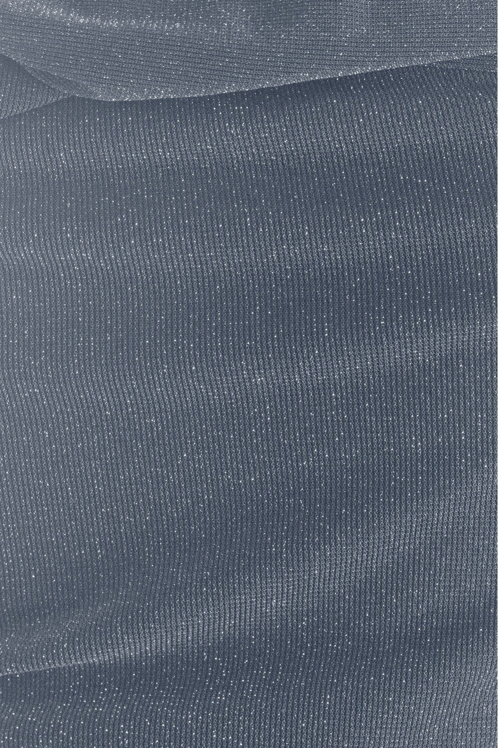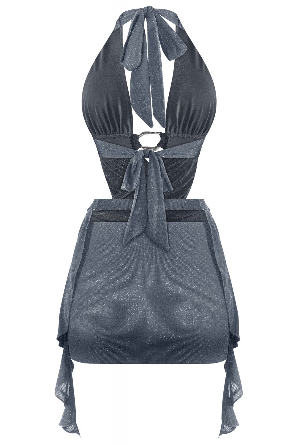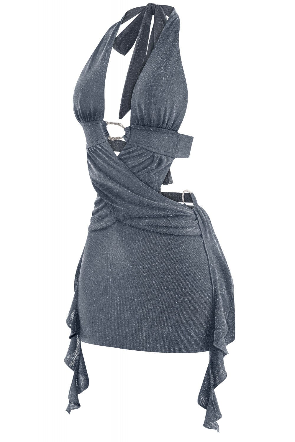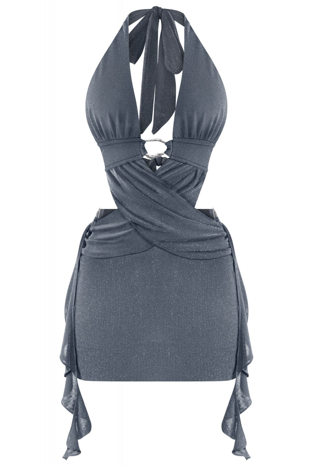 Turn heads in the Some Kind of Wonderful Metallic Mini Dress in a sultry charcoal. This playful sleeveless halter dress shines with silver O-ring and cutout details, while back self-ties and cascading side ruffles add flirty movement. Its stretchy metallic fabric and open-back design keep comfort and bold style in perfect harmony. Perfect for nights you want to sparkle and stand out. C: 92% NYLON / 4% SPANDEX / 4% SILVER THREAD, L: 90% POLYESTER / 10% SPANDEX. Imported.