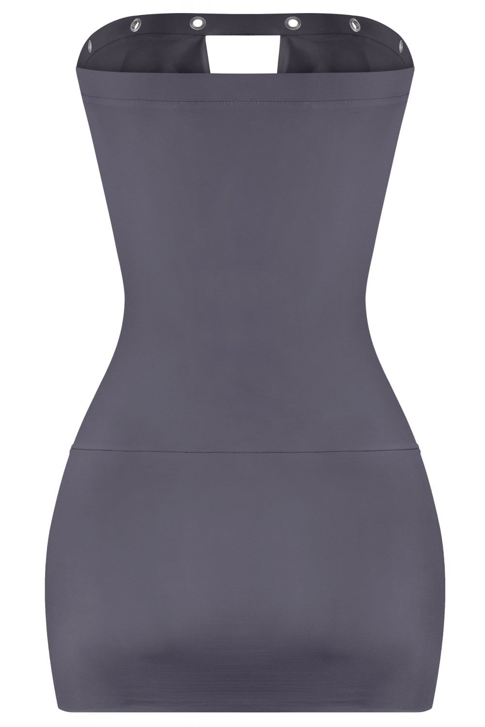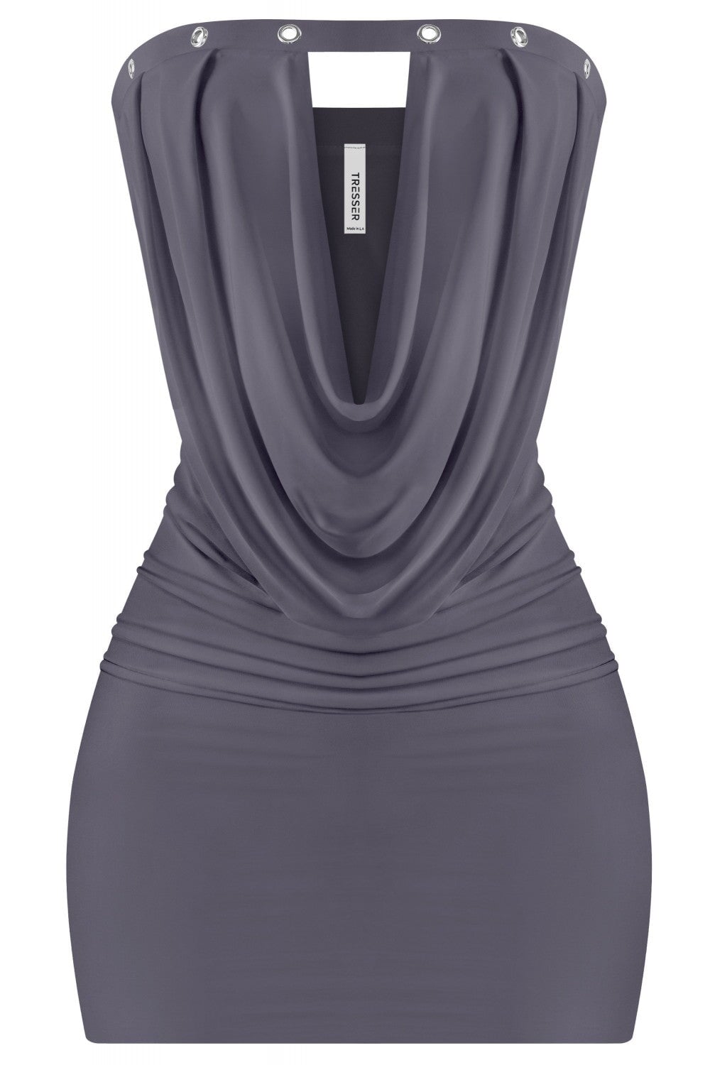 Turn heads in the Tell Me About It Stud Strapless Mini Dress. This daring charcoal grey piece features a sensual cowl neckline and edgy grommet details that add attitude. The mini length shows off your legs, while the double-layered stretchy fabric ensures a flattering fit that moves with you. Perfect for making a confident statement wherever you go. 94% POLYESTER / 6% SPANDEX. Made in USA.